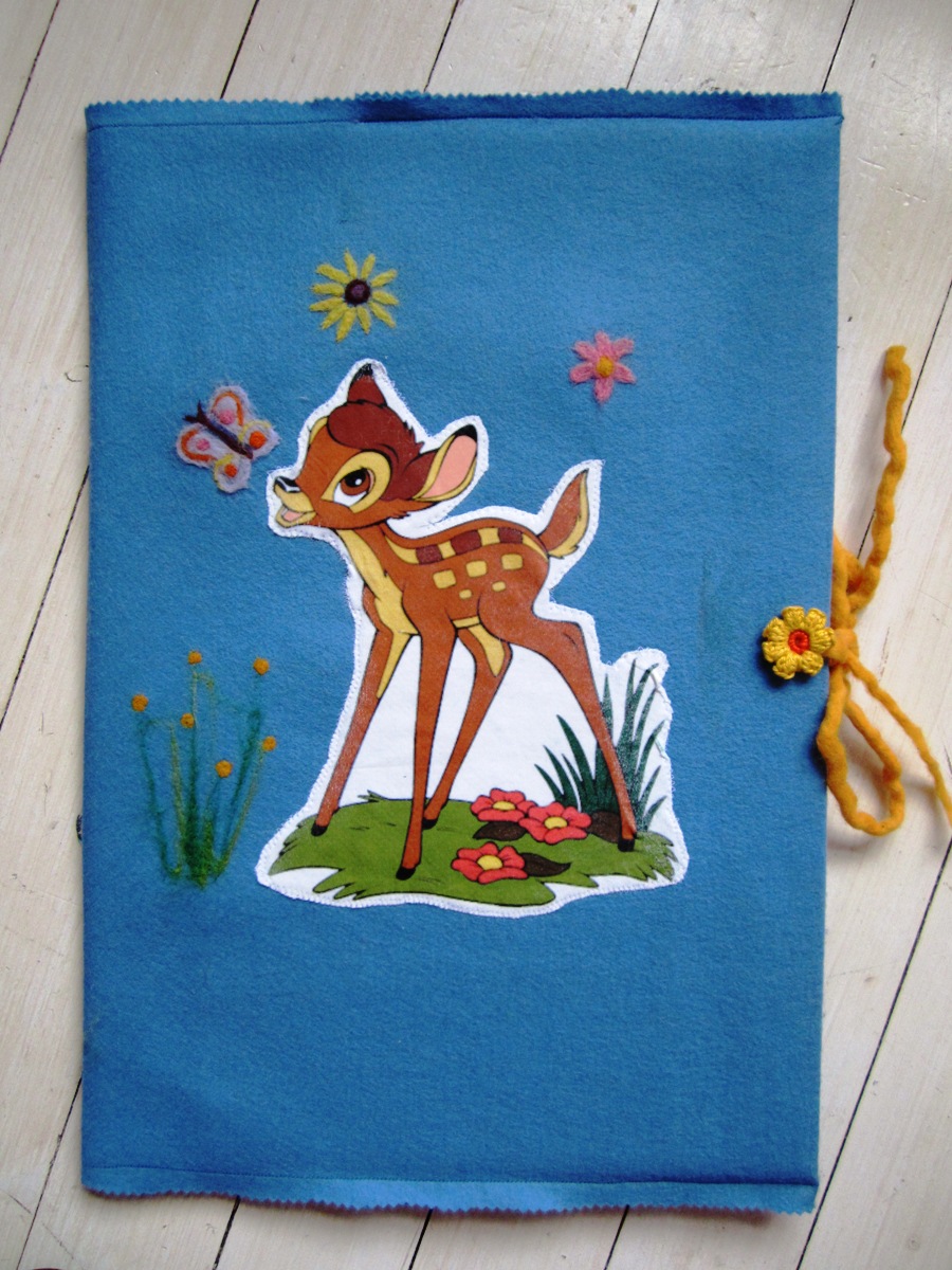 Dus die printte ik uit op transfer papier, streek het hertje vervolgens op een wit t-shirt. Knipte het hertje toen uit en naaide het op de map. Wat bloemen er omheen geprikvilt.